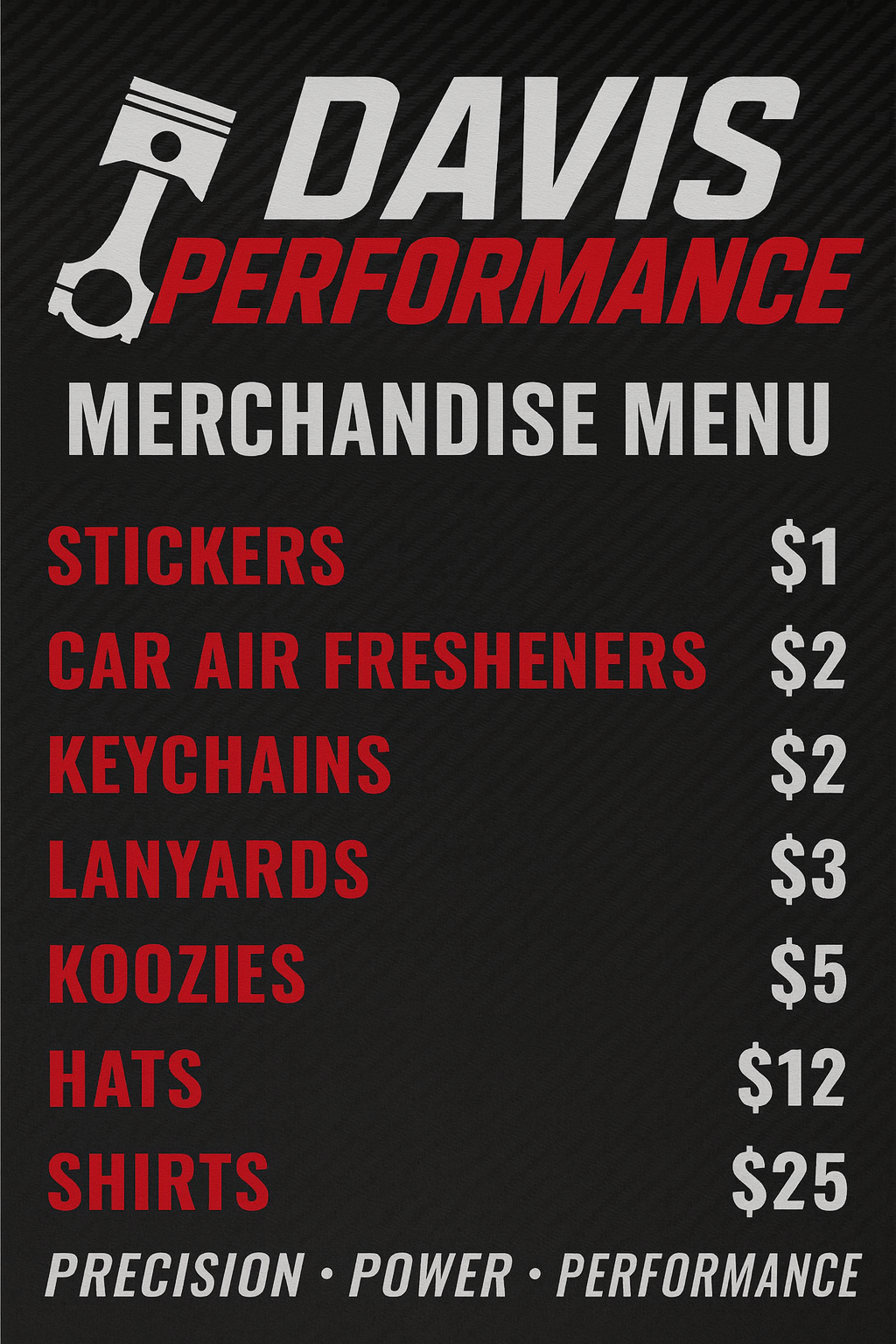 Show off your passion for performance with Davis Performance apparel and gear. Our branded merchandise ranges from stylish t-shirts and hats to accessories perfect for car enthusiasts and gearheads alike.