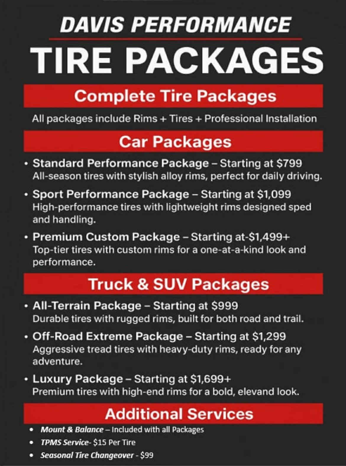 At Davis Performance, we offer complete tire packages that include rims, tires, and professional installation. From everyday performance to off-road durability and luxury upgrades, our car, truck, and SUV packages are designed to fit your style and driving needs — all at competitive prices in Council Bluffs.